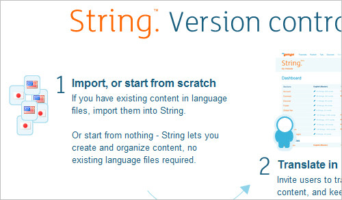 Ukratko, String kontroliše lokalizaciju. Omogućava vam da upravljate fajlovima koji sadrže prevod – od PHP-a preko Rails-a do iPhone aplikacija. Možete pozvati prijatelja da prevede vaš sadržaj, i pratite promjene.Možete dodati nove sekcije i jezike usput, a onda ih preuzeti i postaviti u svoju aplikaciju.