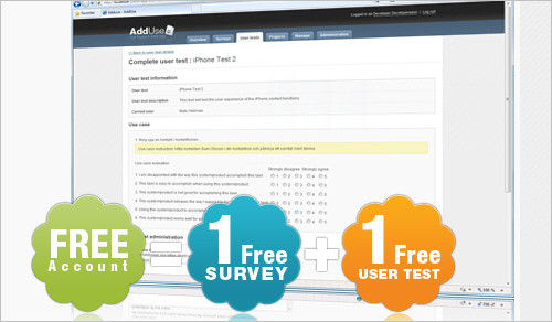 AddUse je alat zasnovan na Webu koji Vam pomaže da kreirate, mijenjate i prezentujete vaša istraživanja brzo jednostavno i jeftino. To je alat koji možete koristiti u bilo kom trenutku, dok razvijate aplikaciju. Prikazuje rezultate testova korisnika, ankete i upitnike u grafičkom okruženju, pomažući marketing i menadžment grupama da donesu pravu odluku.