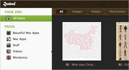 Zootool je sajt za čuvanje sadržaja na koji naletite na netu kao što su slike, dokumenta, linkovi, video klipovi i slično. Omogućava vam da dodate bilo koji sadržaj brzo i jednostavno. Kasnije možete da organizujete taj sadržaj kako vi želite u admin dijelu. Možete ga integrisati sa Tumblr-om, Twitterom kao i mnogim drugim.