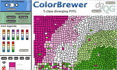 ColorBrewer je alatka koja je napravljena da pomogne ljudima da izaberu dobru kombinaciju boja za mape i druge slike.
