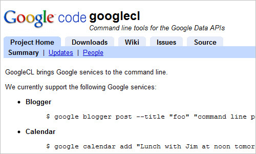 GoogleCL je komandna linija koja pruža pristup svim Google servisima. Možete postovati na Bloggeru, dodavati događaje u kalendar, ili mijenjati dokumente u Google Docs.